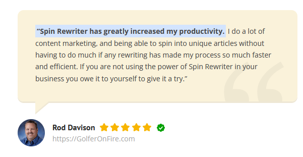 "Spin Rewriter has greatly increased my productivity, allowing me to automatically spin content faster." Being able to spin the content into unique articles without much rewriting has made my process so much faster and efficient with Spin Rewriter. - Rod Davison, GolferOnFire.com, a proud Spin Rewriter Gold member.